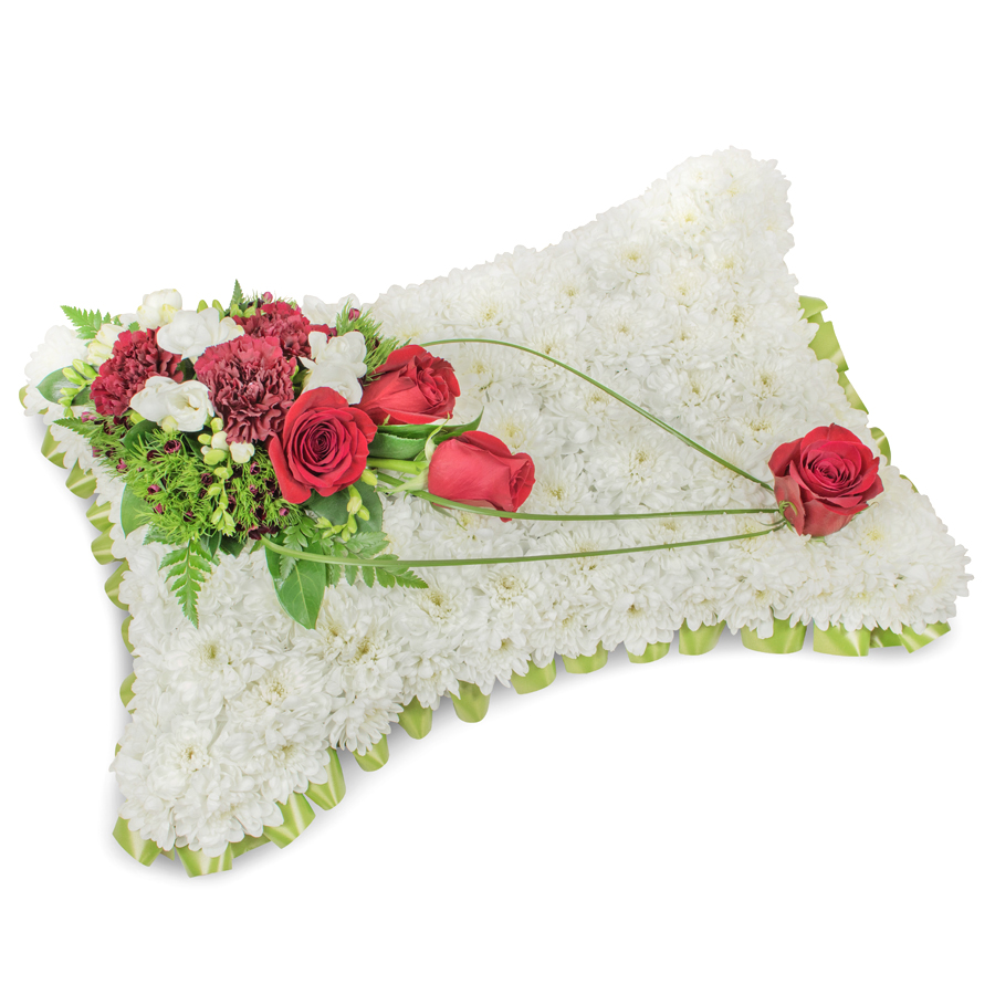 Share your sympathies with our refined sympathy flower arrangement, featuring a unique selection of white chrysanthemums, red roses, white freesias, dark red carnations, dianthus, and bear grass. This elegant bouquet is crafted to convey your heartfelt emotions with grace.